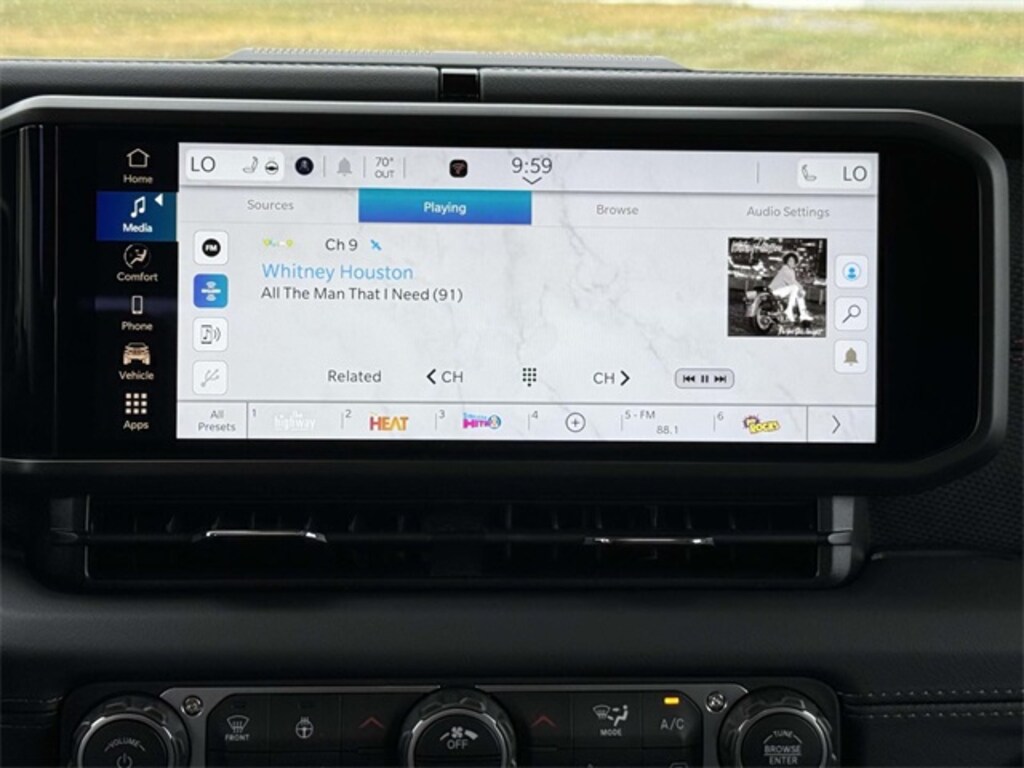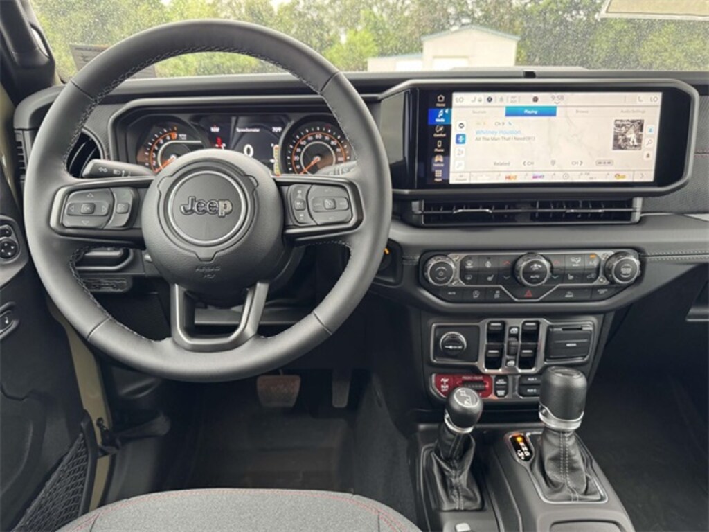 12.3" Touchscreen Display, 4-Wheel Disc Brakes, 4.10 Rear Axle Ratio, 4G LTE Wi-Fi Hot Spot, 8 Speakers, 97 MPH Vehicle Max Speed Calibration, ABS brakes, Air Conditioning, Alexa Built-In, Alloy wheels, AM/FM radio: SiriusXM, Apple CarPlay, Apple CarPlay/Android Auto, Automatic temperature control, Black 3-Piece Hard Top, Brake assist, Cloth Low-Back Bucket Seats, Compass, Connectivity - US/Canada, Convenience Group, Delay-off headlights, Driver door bin, Driver vanity mirror, Dual front impact airbags, Dual front side impact airbags, Electronic Stability Control, Emergency communication system: Jeep Connect, Freedom Panel Storage Bag, Front anti-roll bar, Front Bucket Seats, Front Center Armrest w/Storage, Front dual zone A/C, Front fog lights, Front License Plate Bracket, Front reading lights, Fully automatic headlights, Google Android Auto, Heated door mirrors, Heated Front Seats, Heated Steering Wheel, Illuminated entry, Integrated roll-over protection, Low tire pressure warning, MOPAR All-Weather Slush Mats, MOPAR Hard Tri-Fold Tonneau Cover, MOPAR Performance Satin Black Grille, Occupant sensing airbag, Outside temperature display, Overhead airbag, Panic alarm, Passenger door bin, Passenger vanity mirror, Performance Suspension, Power door mirrors, Power steering, Power windows, Quick Order Package 24R Rubicon, Radio data system, Radio: Uconnect 5 w/12.3" Display, Rear anti-roll bar, Rear reading lights, Rear Sliding Window, Rear Window Defroster, Remote keyless entry, Remote Start System, Security system, SiriusXM Radio Service, SiriusXM w/360L, Speed control, Split folding rear seat, Steering wheel mounted audio controls, Tachometer, Telescoping steering wheel, Tilt steering wheel, Traction control, Trip computer, Universal Garage Door Opener, USB Host Flip, Variably intermittent wipers, Voltmeter, Wheels: 17" x 7.5" Machined/Painted Black.